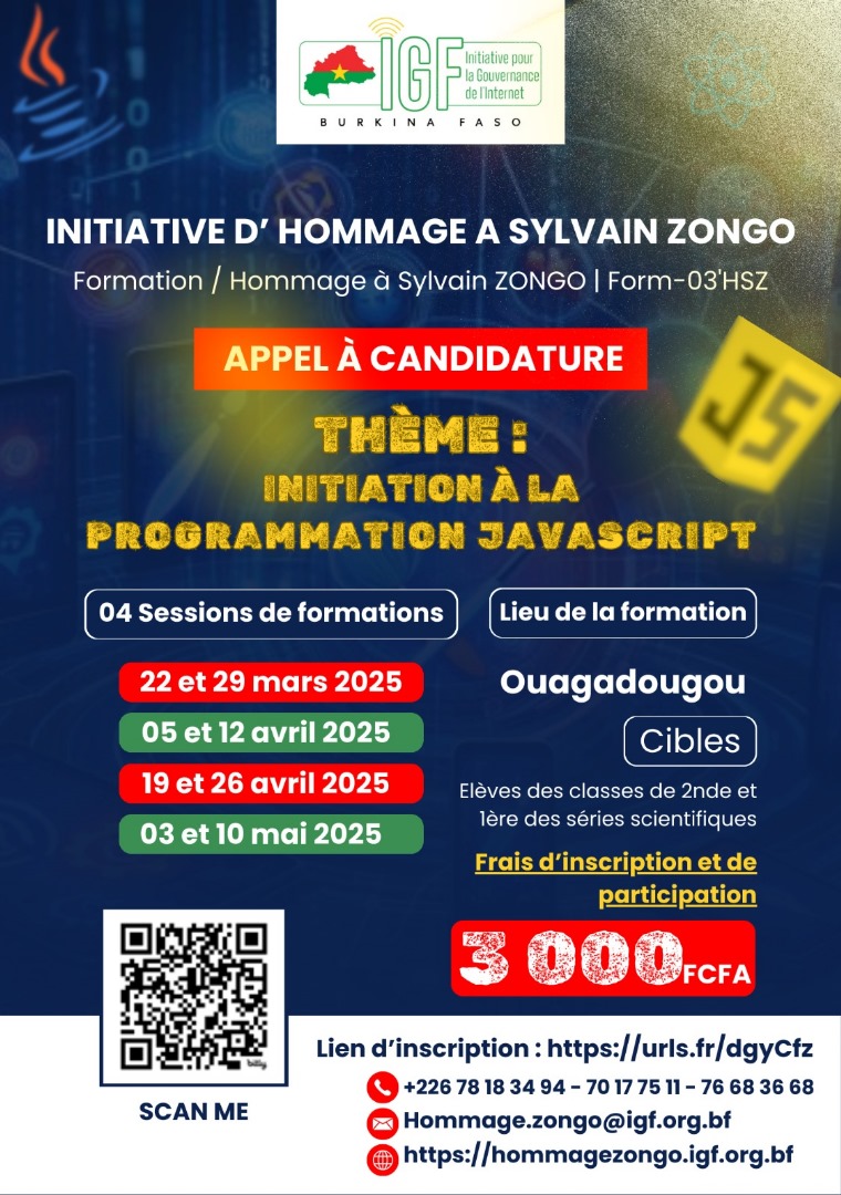 Ouagadougou, April 22, 2025 – As part of the tribute initiative to Sylvain ZONGO (https://hommagezongos.igf.org.bf), a pioneer of the Internet in Burkina Faso and of Free Software in Africa, the Initiative for Internet Governance in Burkina Faso (IGF-BF) organized a training course on the theme “Introduction to JavaScript Programming” for high school and middle school students.